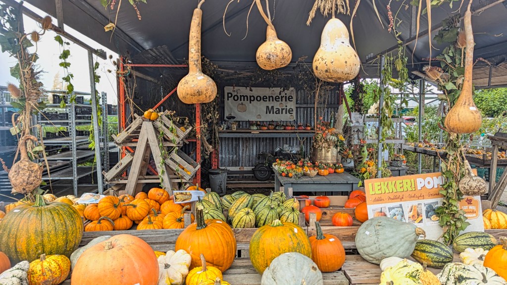Na de wandeling stap ik weer op mijn fiets en rijd richting Vlinders aan de Vliet. Daar maak ik een stop bij Pompoenerie Marie. Hier staan allerlei pompoenen, kalebassen en herfstfruit uitgestald. Veel daarvan zijn eetbaar of geschikt voor decoratie, bijvoorbeeld voor Halloween.