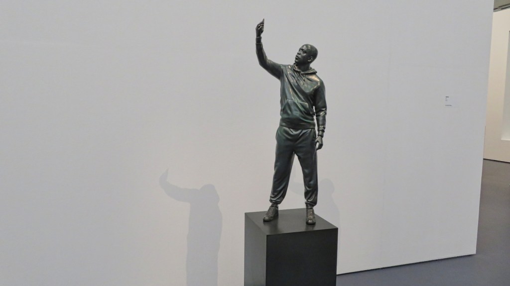 In het weekend bezoek ik zijn tentoonstelling. Voordat ik de Kunsthal binnenloop, wandel ik door het Museumpark, waar de bomen al mooie herfstkleuren krijgen. Voor de ingang van het museum staat het beeld “Reaching Out”, dat doet denken aan het beeld bij het station.