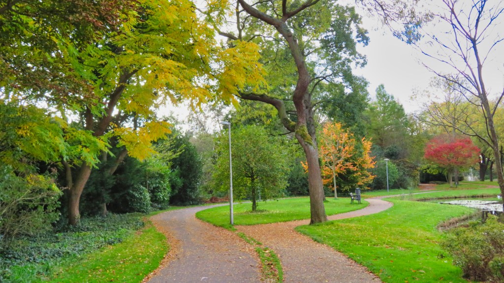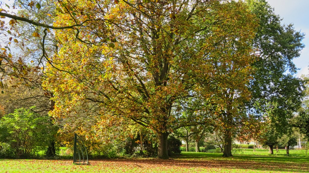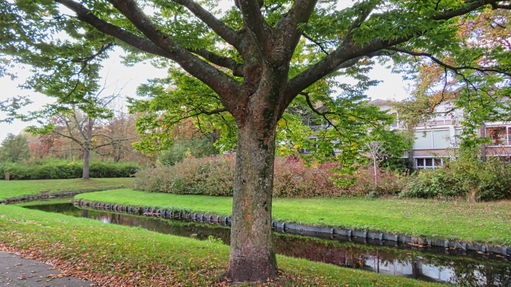 Via de Leidseweg kom ik bij het gemeentehuis. Bij de vijver zie ik een jonge zwarte beuk met zwartbruine bladeren. Bij het fietspad in het Burgemeester Berkhoutpark staat een herdenkingslinde, geplant ter gelegenheid van de troonwisseling in 2013.