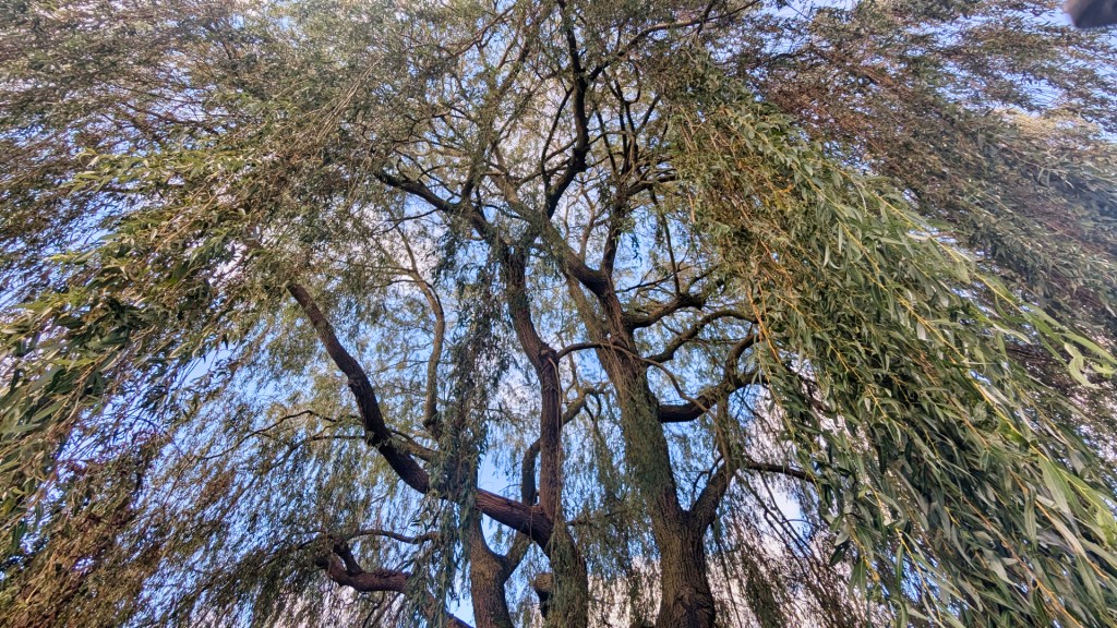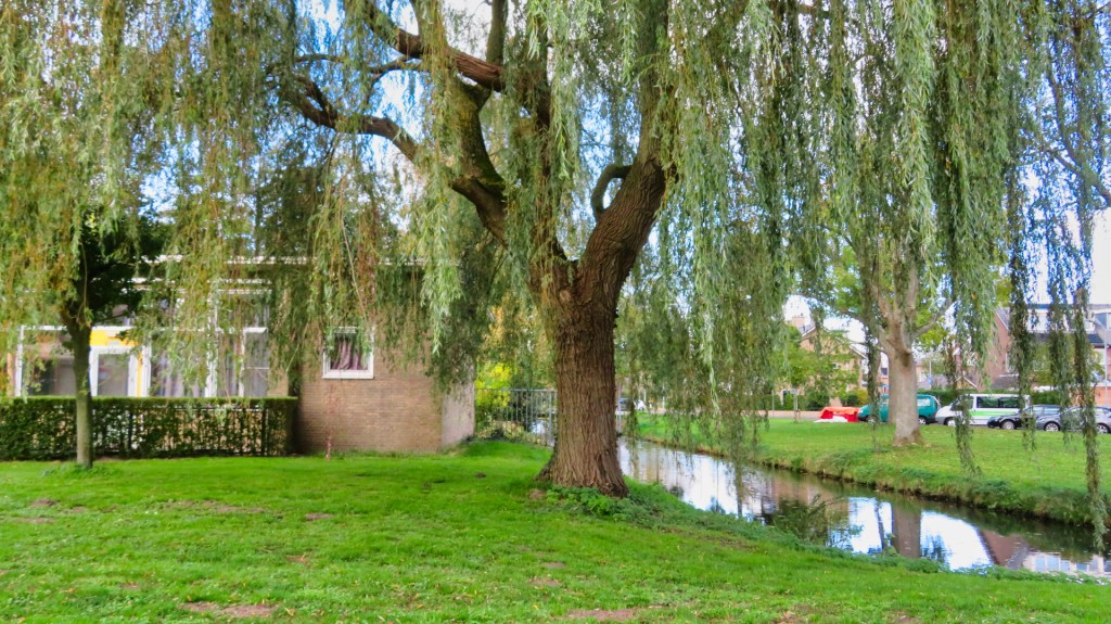 Ik start mijn wandeling bij de Koningin Emmalaan, waar ik oog in oog sta met een enorme gele treurwilg. Deze boom is eind jaren negentig geplant, maar inmiddels uitgegroeid tot een imposante verschijning. De takken hangen laag, waardoor de boom ook wel treurwilg wordt genoemd.