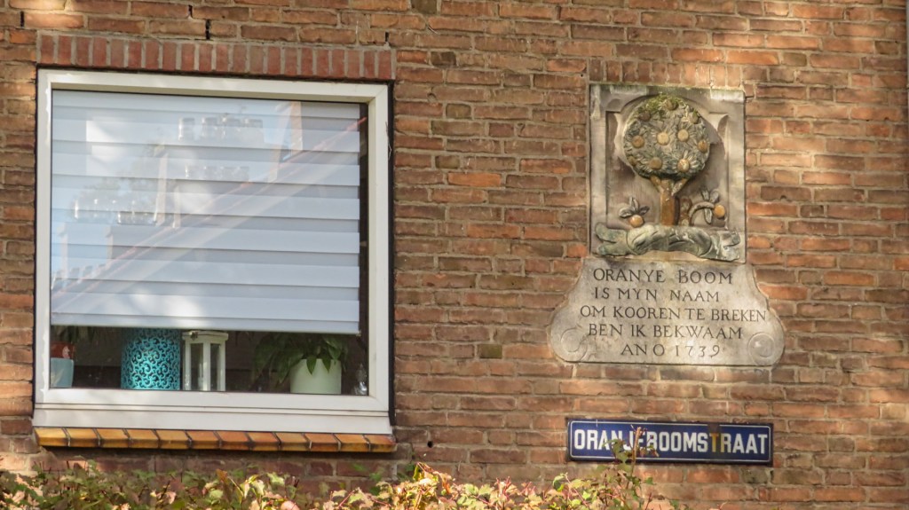Verderop bij de Raadhuislaan staan twee enorme Italiaanse populieren, typerend voor de jaren vijftig en zestig. Bij een flat aan de Raadhuislaan zie ik een gevelsteen van de voormalige korenmolen De Oranjeboom.