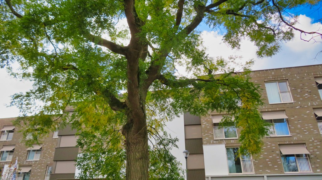 In de tuin van Papelaan 81 staat een enorme zilverberk. De bast van de boom is wit. Ik wandel verder richting de Rouboslaan. Bij het net nieuwe Huize Forestate zie ik weer een Japans exemplaar. Dit is de Honingboom, ook wel de Japanse pagodeboom genoemd.