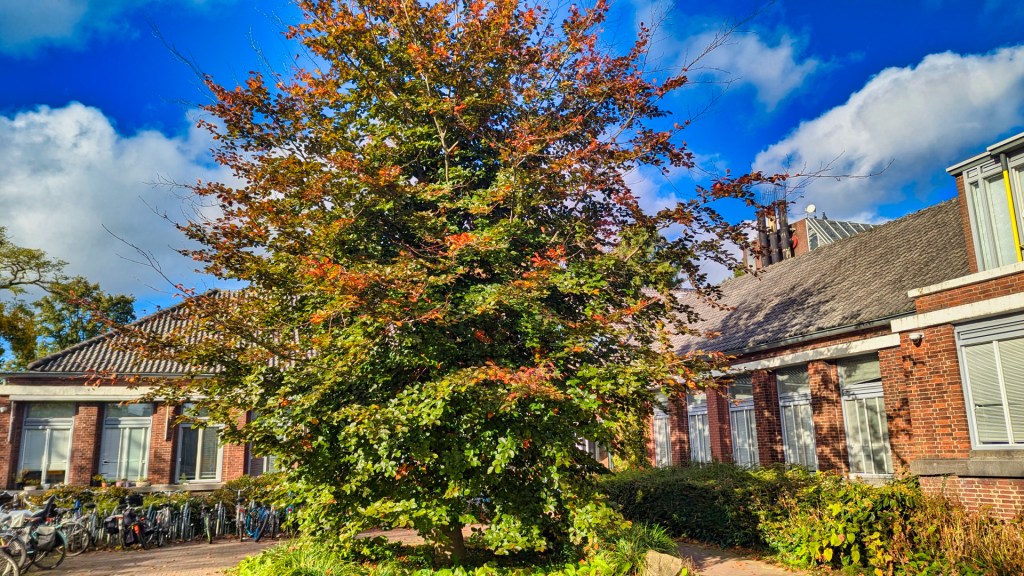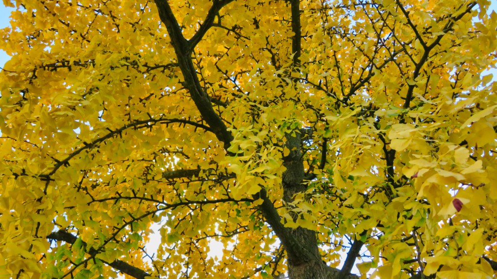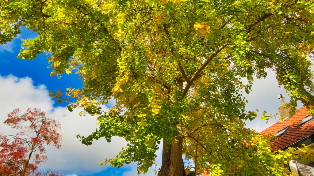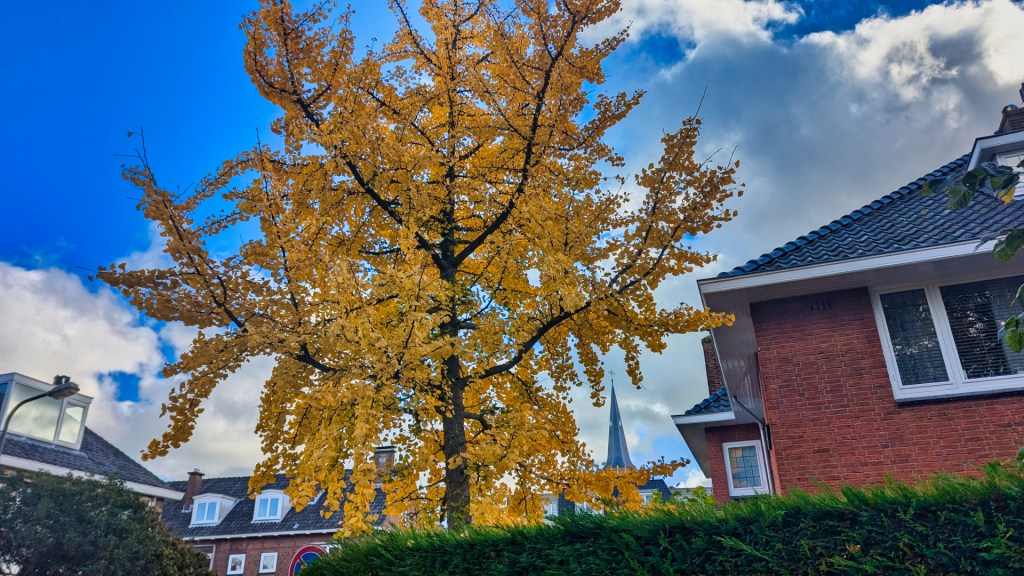 Tegenover de zomerlinde staat een Japanse notenboom. Het blad van deze boom is volledig geel. Deze boom is niet opgenomen in de bomenroute. Maar ik vind het zeker het fotograferen waard. De Ginkgo biloba is een andere naam voor de Japanse notenboom. Het blad lijkt op een zwemvlies van een eend. Daarom wordt deze boom ook wel de eendenpootboom genoemd. In het najaar kleurt het blad prachtig geel.