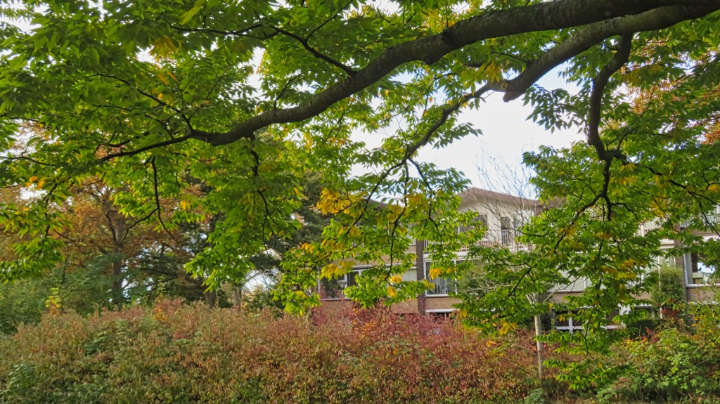 Ik wandel richting de bibliotheek van Voorschoten. In de tuin staat een witte els. De katjes in de boom zijn inmiddels bruine elzenproppen geworden. Aan de Wijngaardenlaan kom ik opnieuw een Japanse notenboom tegen. Deze boom is groter en heeft deels groene en deels gele bladeren.