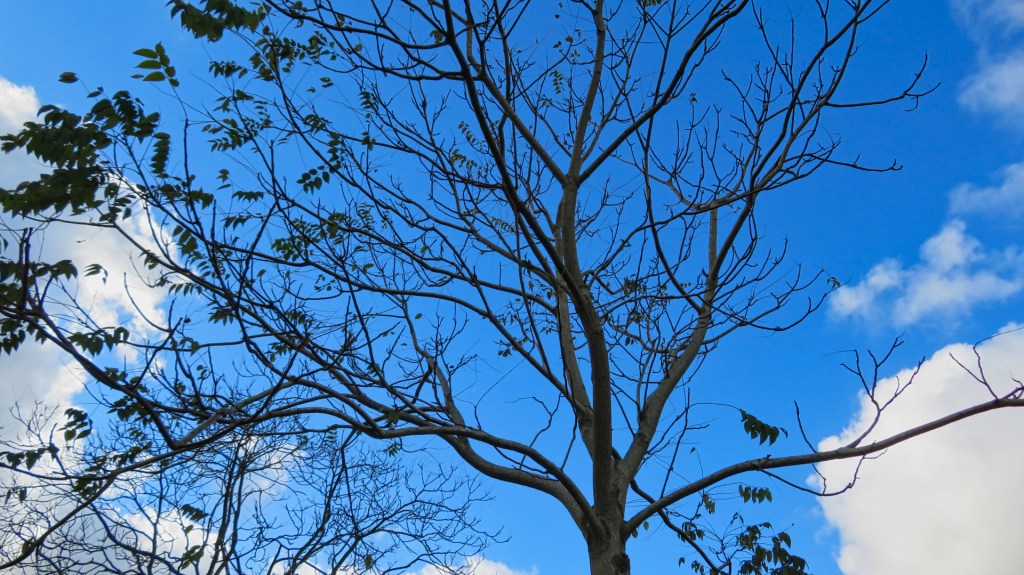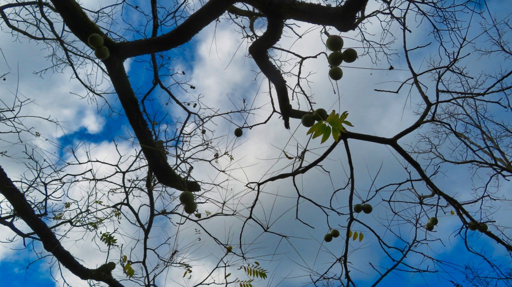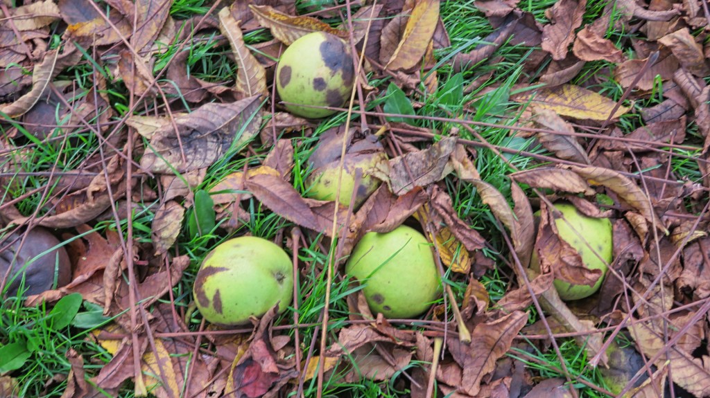 Ik loop het Park Adegeest in, waar enorm veel bijzondere bomen staan. Het lijkt wel een arboretum. Aan het begin van mijn wandelpad staat een zwarte notenboom. De bladeren van deze boom zijn inmiddels gevallen, net als de noten. In de boom hangen er nog enkele. De noten worden vaak in desserts en taarten verwerkt.