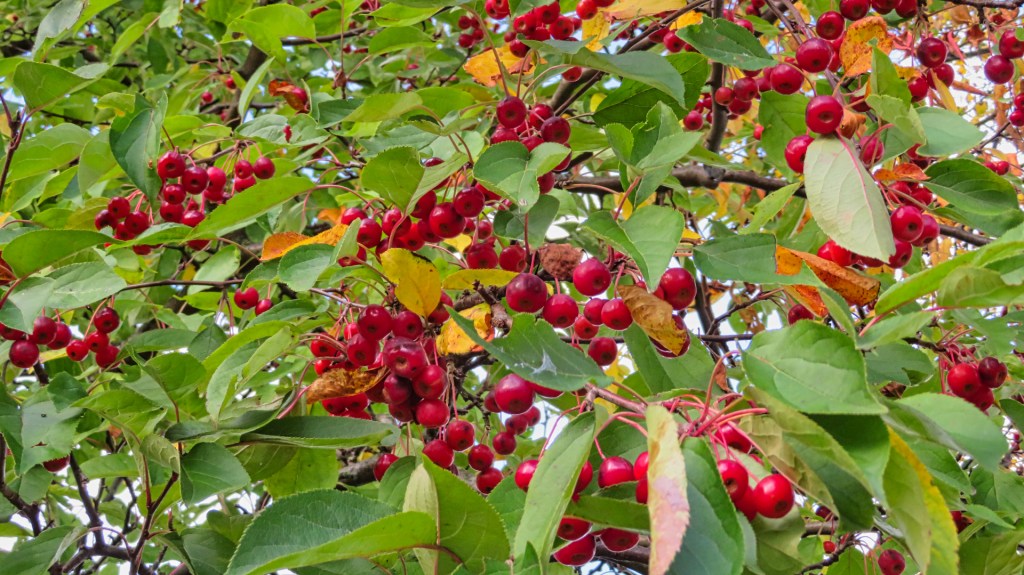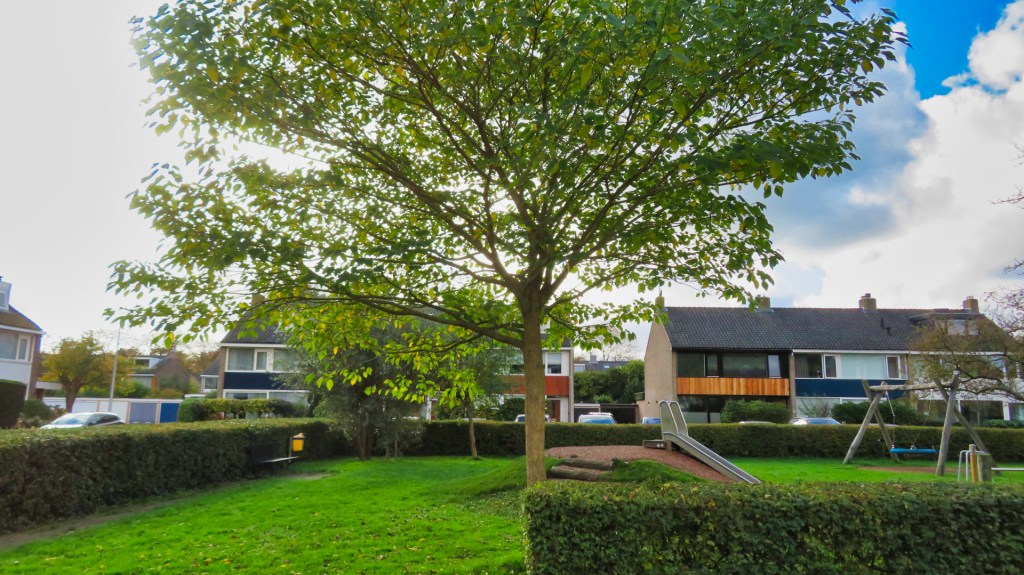 Ik wandel door woonstraten en kom op een groot grasveld bij de Schimmelpenninck van der Oyenlaan twee grote zilveresdoorns tegen. Bij het Van Dulmplein zie ik bomen met prachtige vruchten: de kersappel en de kardinaalmuts. De kersappel is een kleine, rode appel, ter grootte van een kers, die zuur smaakt. Vroeger werd hij gebruikt in kerstdecoraties en voor het maken van sterke drank.