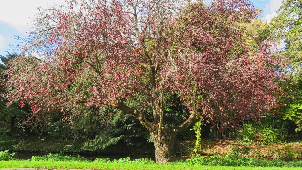 Ik loop de Oranjekade op. Vroeger stond hier een aantal grote gele treurwilgen. Veel van deze wilgen zijn gekapt. Ze zijn vervangen door jongere varianten. Verderop aan de Oranjekade staat een kerspruim. Deze boom heeft al een groot deel van zijn purperen blad verloren. In het voorjaar zijn de roze bloemen van de boom prachtig.
