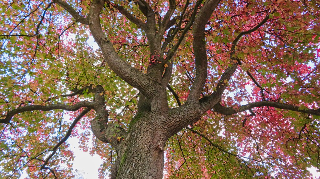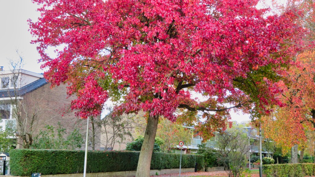 Ik kan een aantal bordjes van de bomen niet vinden. Mogelijk zijn deze door het herstraten verdwenen. Bij de Palestrinalaan vind ik weer een bordje tussen de gevallen bladeren. Het is de prachtige rode amberboom.