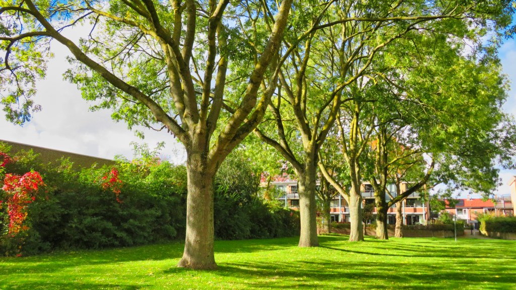Ik wandel richting het Zuster Anna Lambooplantsoen. Het is vernoemd naar Zuster Anna Lamboo. Zij was veertig jaar kraamverzorgster in Voorschoten. Bij de entree van het plantsoen zie ik drie essen.