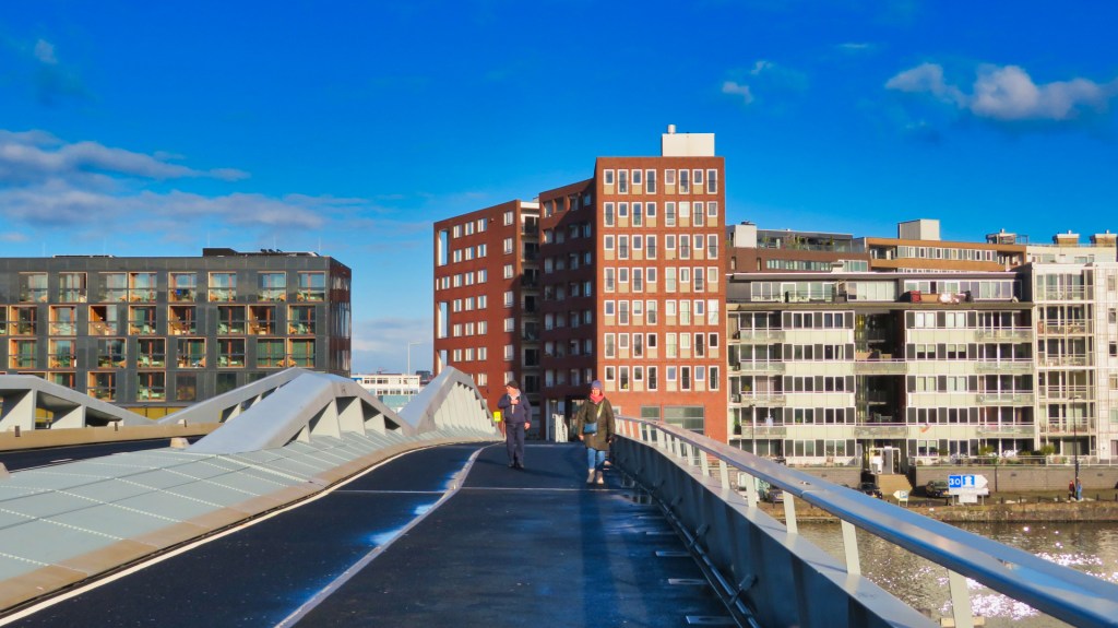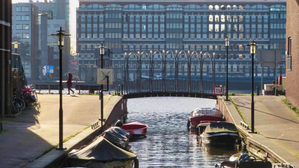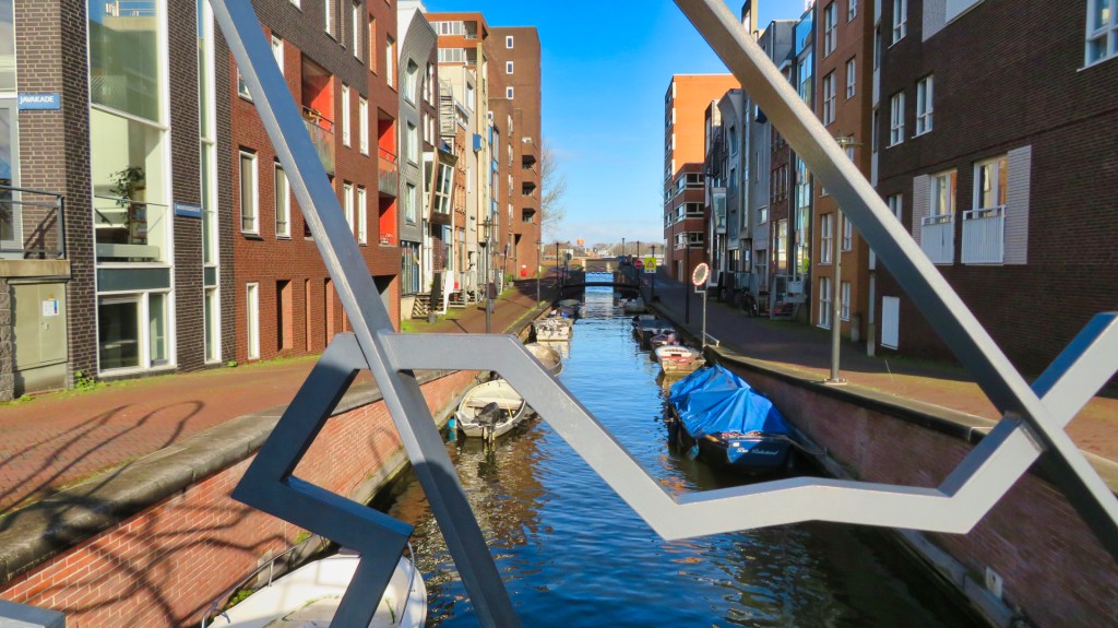 Ik wandel over de iconische Jan Schaeferbrug en kom aan op Java-eiland. Dit is een bijzonder stukje Amsterdam, dat in de jaren negentig werd ontwikkeld door architect Sjoerd Soeters. Hij werd geïnspireerd door de Amsterdamse grachtenpandjes. Soeters vroeg verschillende architecten om de woonblokken te ontwerpen, zodat je veel verschillende stijlen ziet. Ik wandel over de Javakade en zie de verschillende dwarsgrachtjes en de boogbruggen. Je vindt hier een verscheidenheid aan woningen voor gezinnen en senioren.