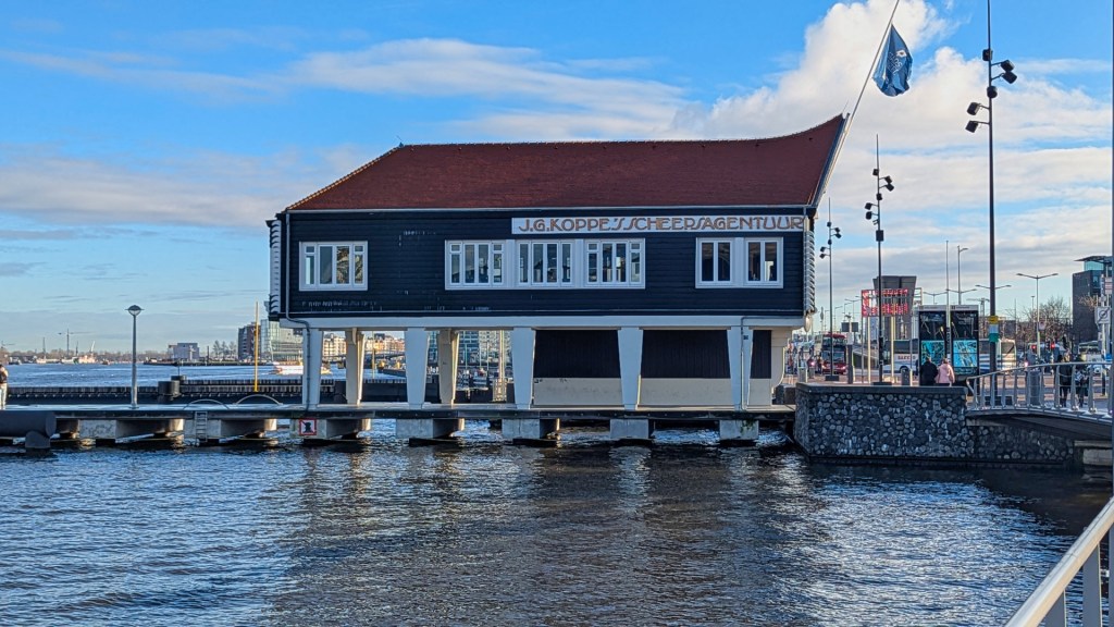 Ik start mijn wandeling langs de IJ-kade. Daar zie ik het NACO-huisje. Het is een klein historisch gebouw dat vroeger het havenverkeer beheerde. Het huisje in de sierlijke Amsterdamse Schoolstijl is mooi gerestaureerd. Het heeft een nieuwe bestemming gekregen in het vernieuwde gebied langs de IJ-zijde van Amsterdam. Ik wandel voetje voor voetje om niet uit te glijden op de kade.