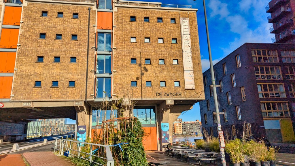 Ik wandel langs pakhuizen op de Zuidelijke IJ-oevers en passeer Pakhuis de Zwijger. Dit voormalige pakhuis is omgebouwd tot een veelzijdig cultureel centrum, waar lezingen, debatten, filmvertoningen en live muziek plaatsvinden.