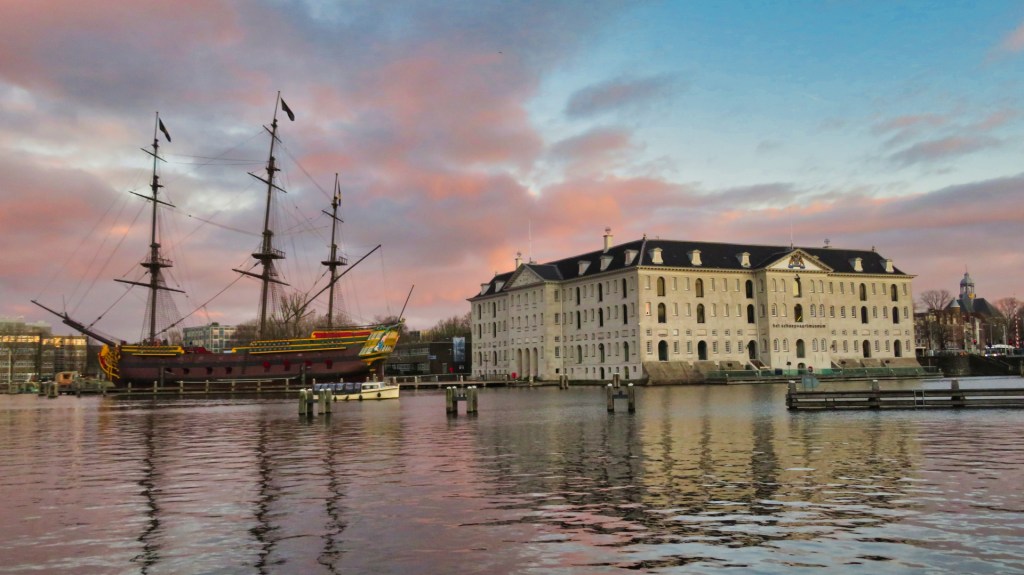 Na het Wereldmuseum wandel ik verder via het Entrepotdok, langs dierentuin Artis en door de Plantagebuurt. Ik loop langs de Hollandsche Schouwburg en het Holocaustmuseum. Langzaam begint het te schemeren. Ik bereik uiteindelijk het Scheepvaartmuseum en de Openbare Bibliotheek. Amsterdam ziet er prachtig uit in het avondlicht en ik schiet nog wat mooie foto’s van het Scheepvaartmuseum. Ik wandel weer terug naar Amsterdam Centraal, waar ik eerder de dag mijn wandeling begon.