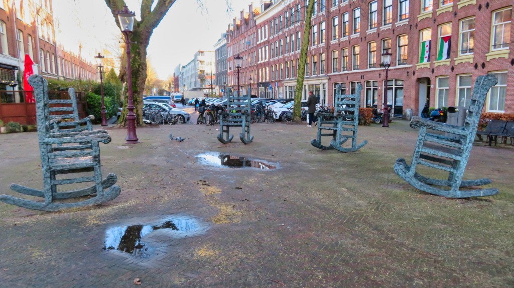 Verderop kom ik bij het Pieter Vlamingplein, waar ik het kunstwerk “Schommelstoelen en Wippen” zie. De kunstenaar Handle with Care is ook bekend als kunstenaar Lyanne van Diepen. Zij maakte dit werk om huiselijkheid en rust uit te stralen in de drukke Dapperbuurt.