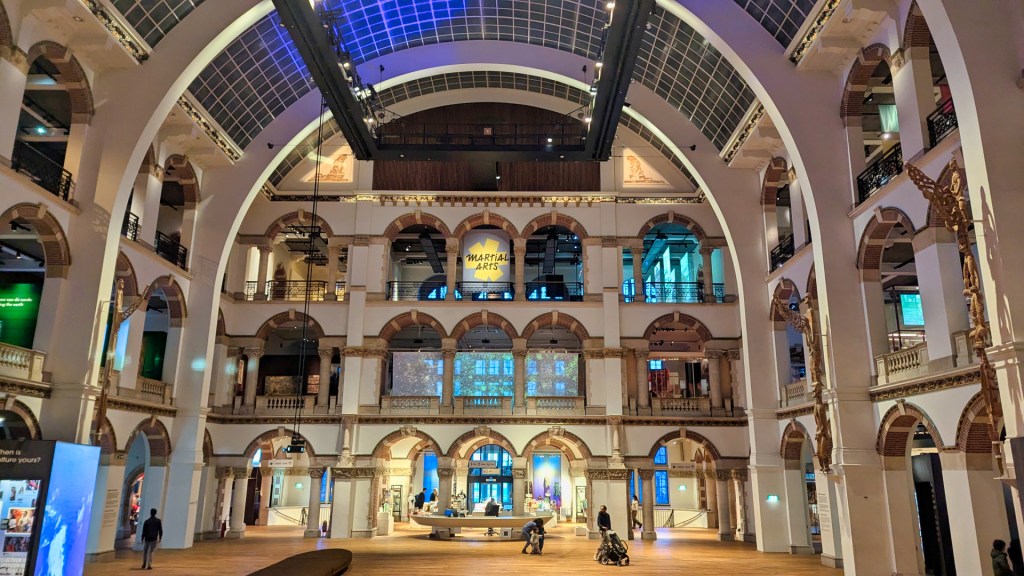 Ik maak een uitstapje naar het voormalige Tropenmuseum, nu het Wereldmuseum, voor de tentoonstelling “Martial Arts”. Deze tentoonstelling gaat over de wereld van vechtsporten. Het is niet alleen fysiek vechten. Het gaat ook over verdedigen, meditatie en zingeving. Het is een interactieve tentoonstelling. Je kunt tegen een boksbal slaan of met elkaar sparren in de ring. Ook kun je mediteren in de meditatieruimte. Ik zie veel verschillende vechtsporten, van boksen en kickboksen tot capoeira en kungfu.