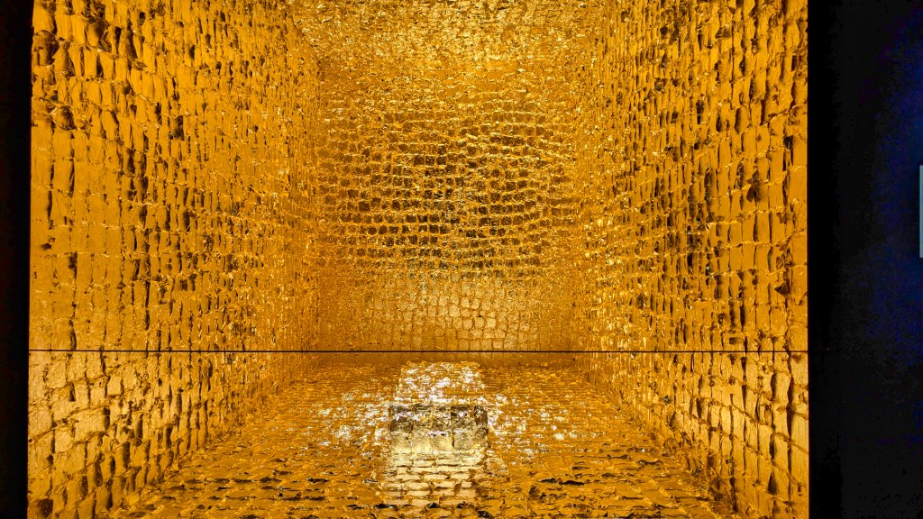 Vervolgens zie ik hoe alchemisten ooit dachten goud te kunnen maken of er magische krachten aan toe te schrijven. Tot slot gaat de tentoonstelling over goud en de dood. Er zijn dodenmaskers te zien. Het kunstwerk The Death of James Lee Byars is ook aanwezig. Dit kunstwerk vind ik heel indrukwekkend. De installatie van bladgoud is hier precies nagebouwd. Het symboliseert de dood als een transformatieproces, waarbij goud staat voor spirituele rijkdom.