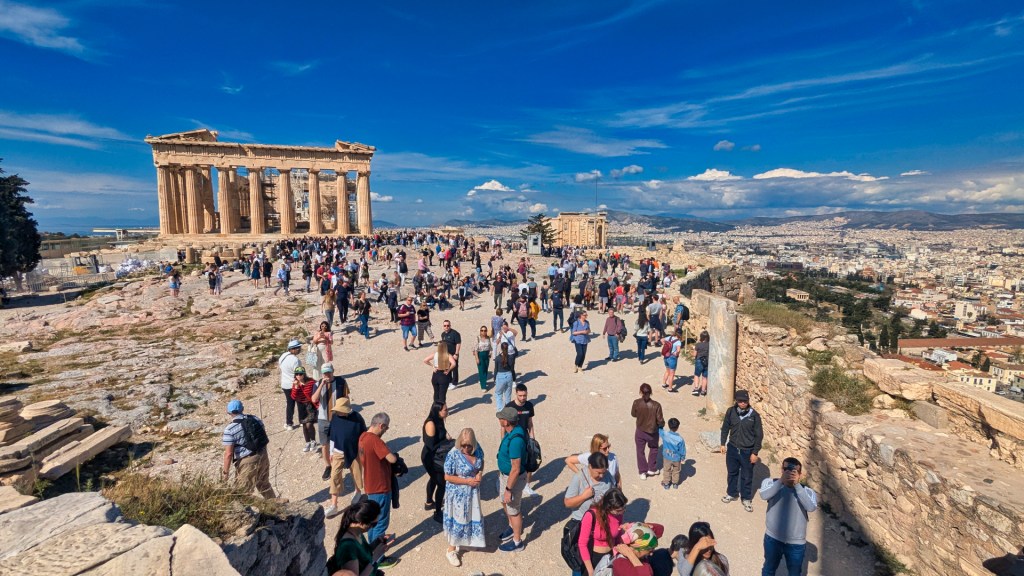 Langzaam wordt het drukker. De mensenmassa komt samen bij de Propylaeën, de toegangspoort tot de Akropolis. Iedereen moet hier langs, zowel mensen die binnenkomen als mensen die weer weggaan. Niet mijn favoriete situatie, zeker omdat het wat steil is en ik niet zo van hoogtes houd. Voor me zie ik een vrouw op krukken. Ik heb echt met haar te doen.