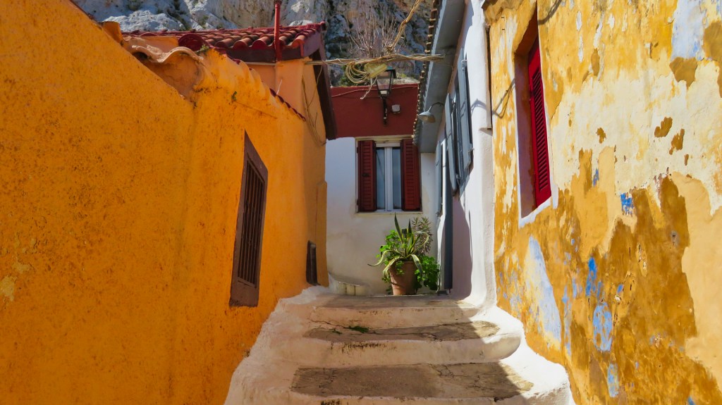 Mijn route gaat door de wijk Plaka. Ik wandel langs terrasjes, antiekwinkels en straten vol galerieën. Verkopers prijzen hun nep-gouden diademen aan. Propers proberen toeristen te verleiden tot een bord souvlaki. Ze bieden ook een Griekse salade met feta aan.