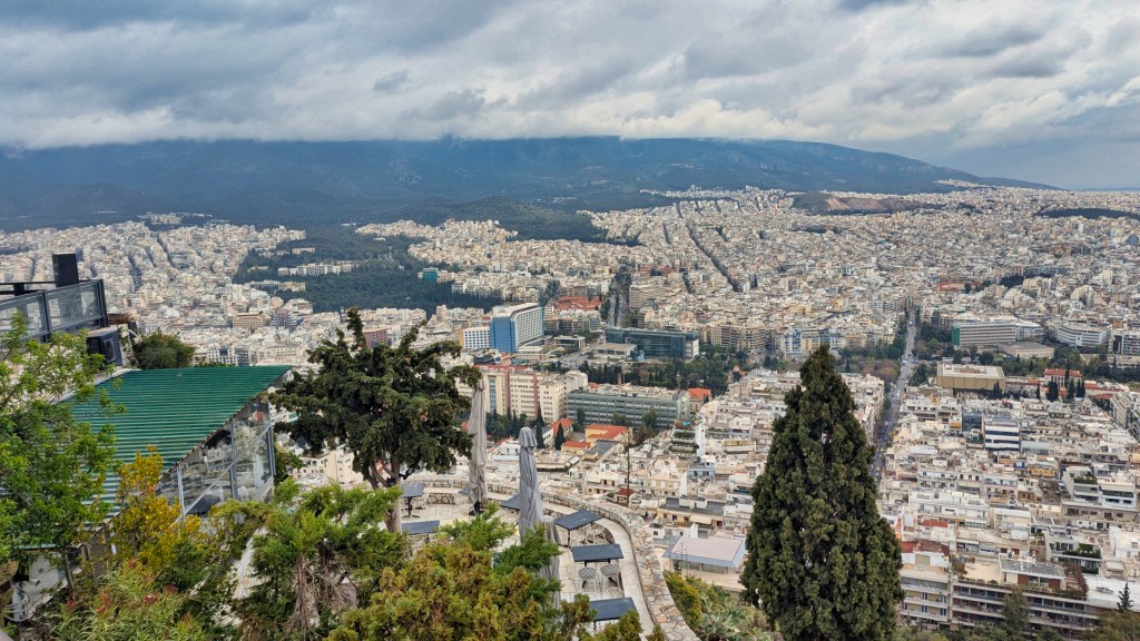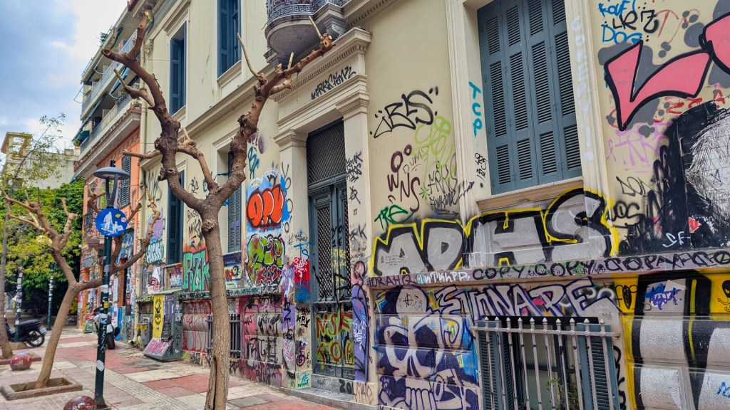 Vanaf hier daal ik rustig af richting de wijk Exarcheia. De paden zijn glad door wat regen. Mijn bergschoenen hebben het juiste profiel voor een bergwandeling, maar niet voor de stad. Ik moet geregeld afremmen om niet uit te glijden op de glibberige stenen. De omgeving verandert onderweg. De chique wijk Kolonaki maakt plaats voor een rauwere wijk Exarcheia met veel graffiti, kleine cafés en tweedehands boekwinkels.