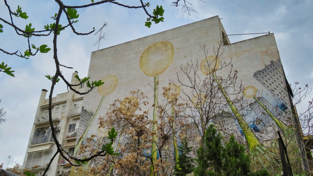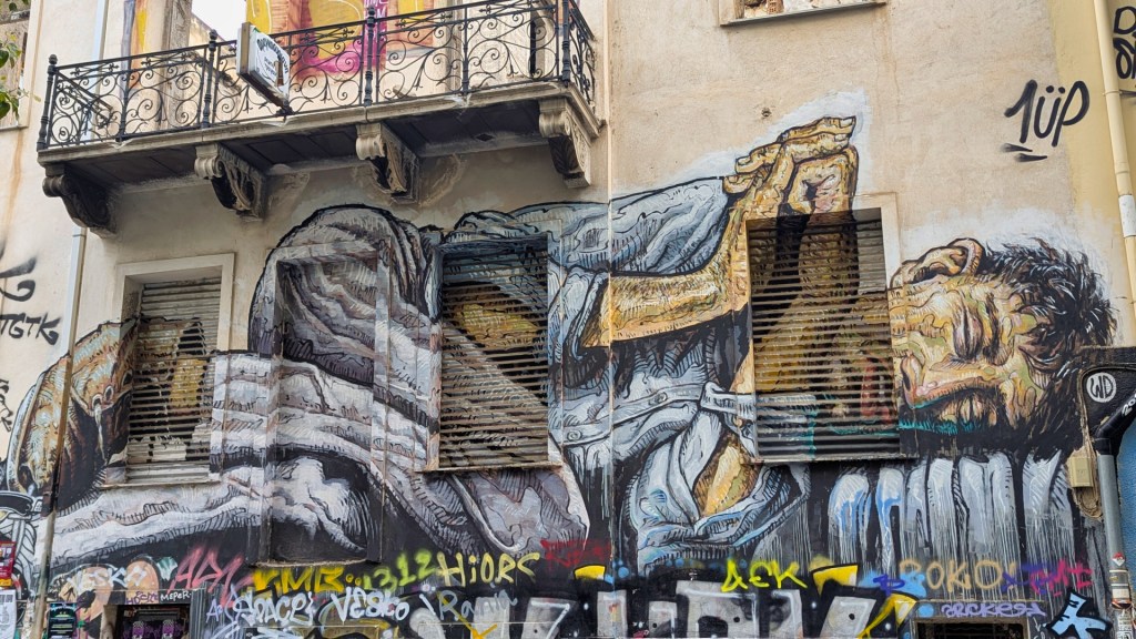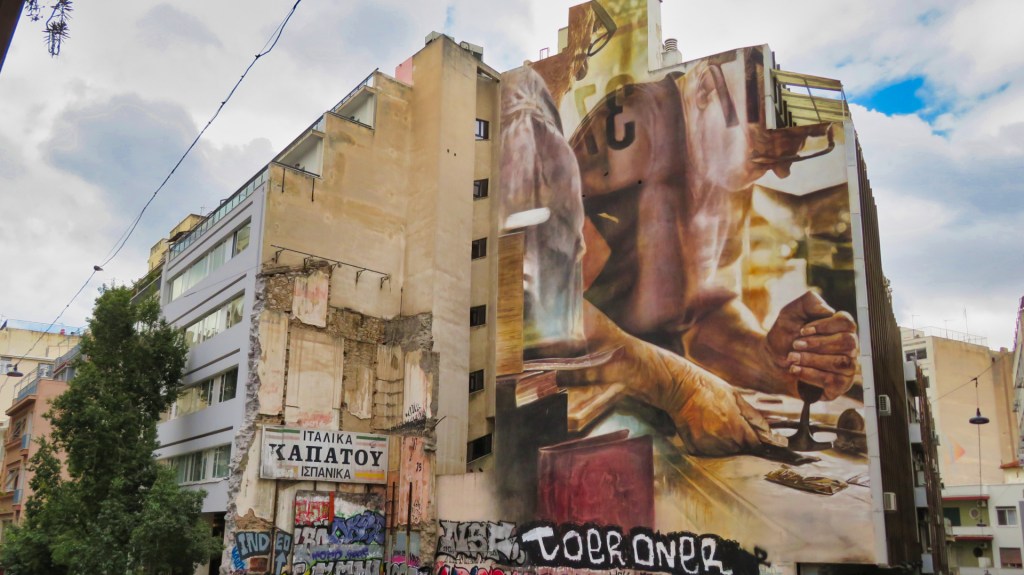 Als ik door de straten van Exarcheia wandel, zie ik een enorme muurschildering aan de zijkant van een gebouw. Op de muur ligt een man afgebeeld die op straat slaapt. Ik blijf er even bij stilstaan. Het kunstwerk is gemaakt door de Griekse street artkunstenaar Wild Drawing, die zijn werk signeert met WD. Linksonder lees ik de boodschap die WD erbij heeft geschreven: “Voor alle armen en daklozen, hier en overal ter wereld.”