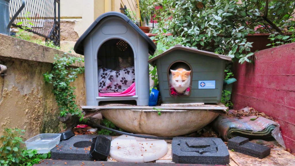 Langs één van de trappen zie ik twee kleine plastic huisjes voor zwerfkatten. In het ene ligt een rood-witte kater. Hij past er maar net in. In het andere ligt een grijze poes. Ze ligt als een diva op een dik kussen. Af en toe schieten er katten weg tussen de struiken.