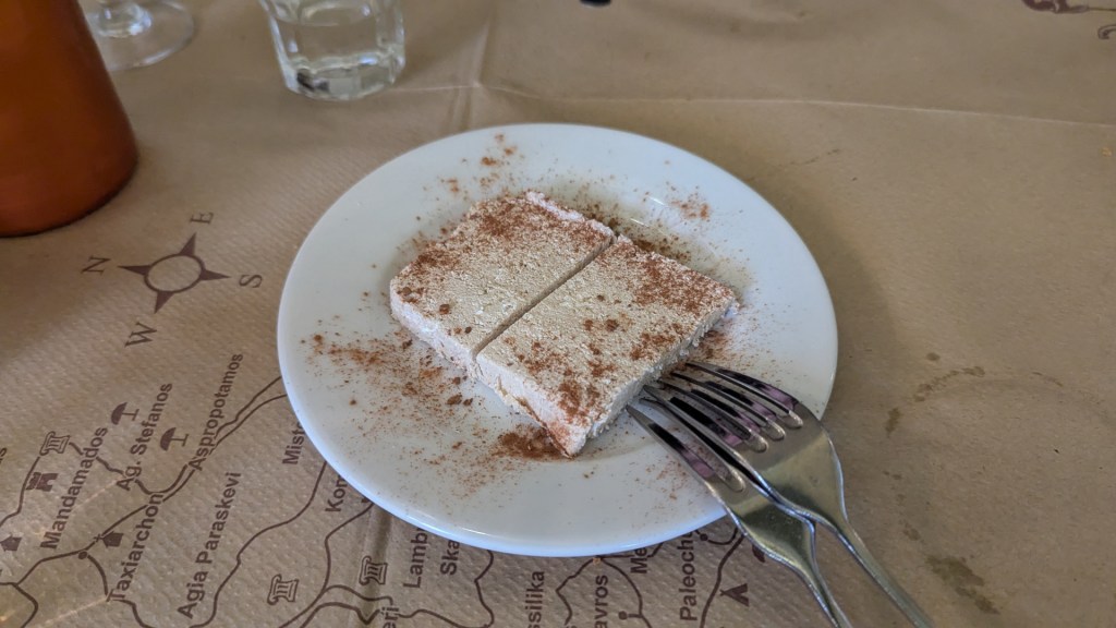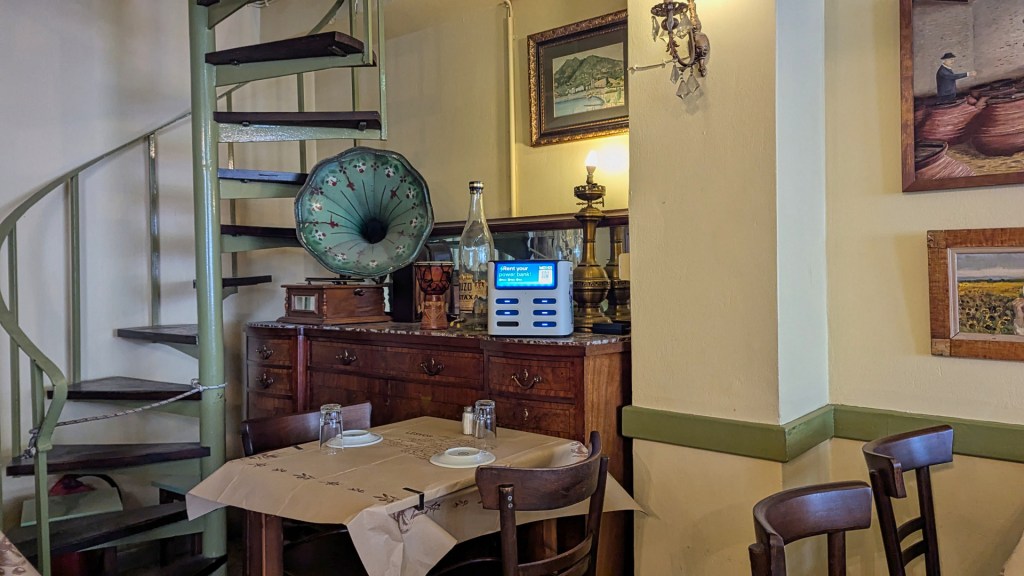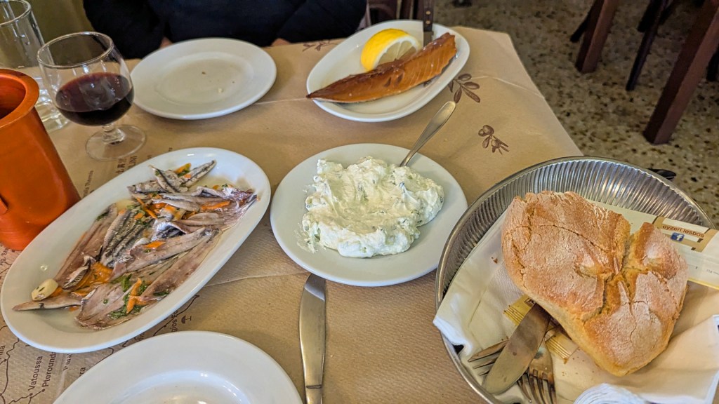 Ik sluit mijn wandeling af bij “Ouzeria Lesvos”, een klein en gezellig visrestaurant aan de Emmanouil Benaki straat. Het bestaat al sinds de jaren 60 en is opgericht door twee broers uit het Griekse eiland Lesbos. Ik stel mijn eigen bord met hapjes samen met gemarineerde ansjovis, gestoomde makreel, tzatziki en Griekse patatjes. Alles smaakt even lekker. Als verrassing krijg ik van het huis nog een toetje gemaakt van amandelen.