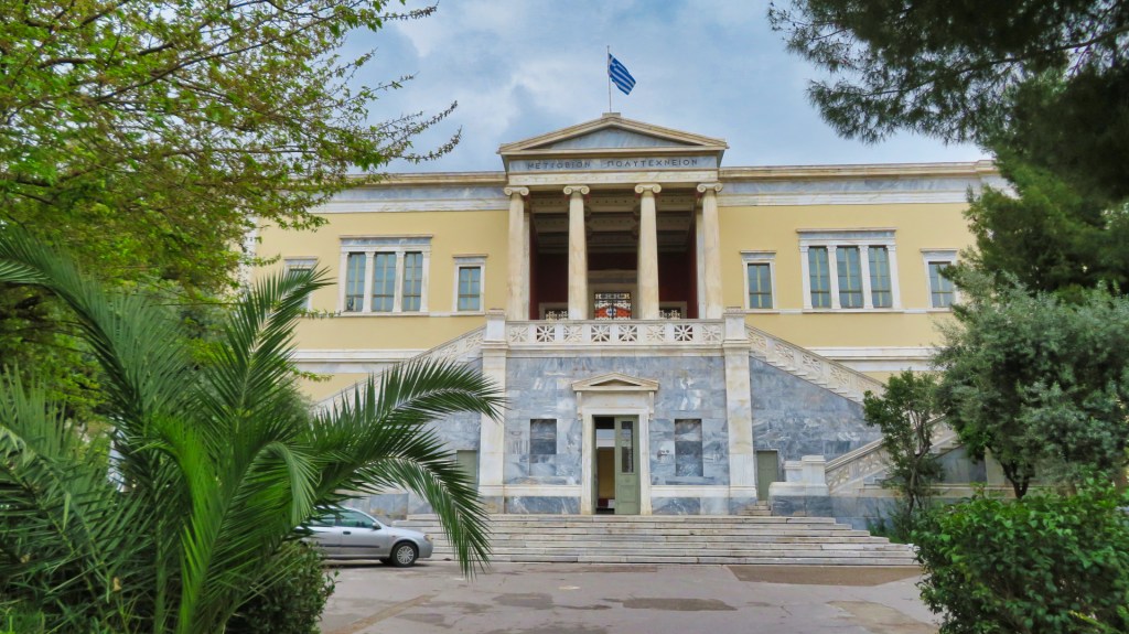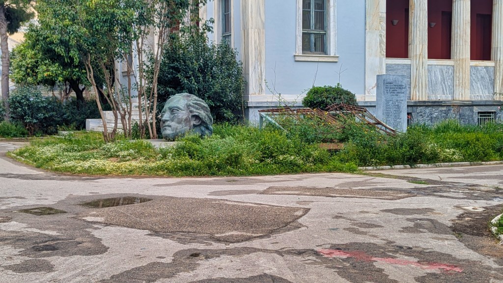 Voor de Technische Universiteit sta ik even stil bij een bijzonder monument. Het herdenkt de studentenopstand van 1973, toen studenten in verzet kwamen tegen de militaire dictatuur. De bezetting van de universiteit werd toen hard neergeslagen, waarbij doden vielen. Nog altijd wordt deze gebeurtenis elk jaar op 17 november herdacht in Athene.