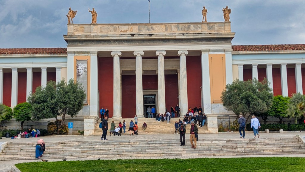 Ik maak een korte omweg naar het Nationaal Archeologisch Museum en de Technische Universiteit van Athene. In het park voor het museum kom ik toevallig het Deense stel weer tegen. Ze zwaaien uitbundig.