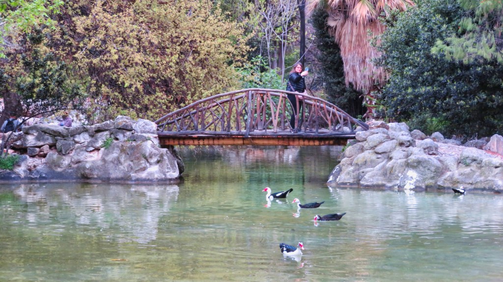 Na de wisseling loop ik de Nationale Tuinen in. Dit park ligt midden in de stad en is verrassend rustig. Ik volg een pad langs een vijver waar muskuseenden waggelen. Twee eenden jagen elkaar achterna, alsof het lente is. Ik wandel langs een kleine kinderboerderij met nog meer eenden en geiten. Ook is er een barretje in de tuinen, maar dat is op dat moment nog gesloten.