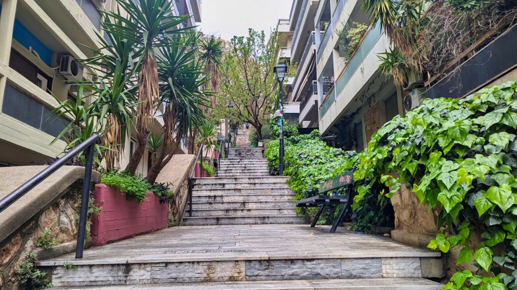 Na het park begint het echte klimwerk. Mijn route gaat omhoog richting de wijk Kolonaki, de meest chique wijk van Athene. Onderweg kom ik langs smalle straatjes, trappen en stijlvolle modezaken. Ik zie luxe boetieks, goed geklede Atheners en cafés waar mensen rustig aan hun eerste Griekse koffie zitten.