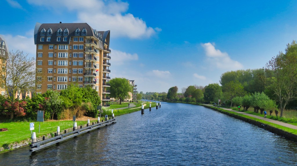 Vanaf daar steek ik door naar de Vliet. Een wandelaar met hond komt me tegemoet en op de blauwe Vlietbrug haalt een fietser me in. Vanaf de brug heb ik goed zicht op de architectonische wijk Adegeest.