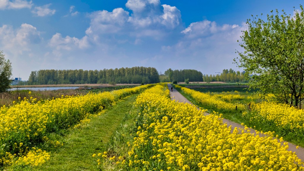 Na een tijdje verlaat ik de Vlietlanden en steek ik de weg over. Een graspad leidt me verder tussen bloeiend koolzaad en fluitenkruid. Mijn schoenen zakken weg in het vochtige gras, maar dat hoort erbij. Ik blijf maar plaatjes schieten van het lentegroen.