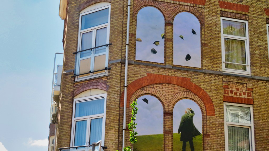 Ik wandel verder naar Katendrecht. Op een gevel zie ik een bijzonder kunstwerk van Teun Hocks. Een man kijkt omhoog. Hoeden dwarrelen door de lucht als bladeren. Het werk staat symbool voor aankomst, afscheid en vertrek.
