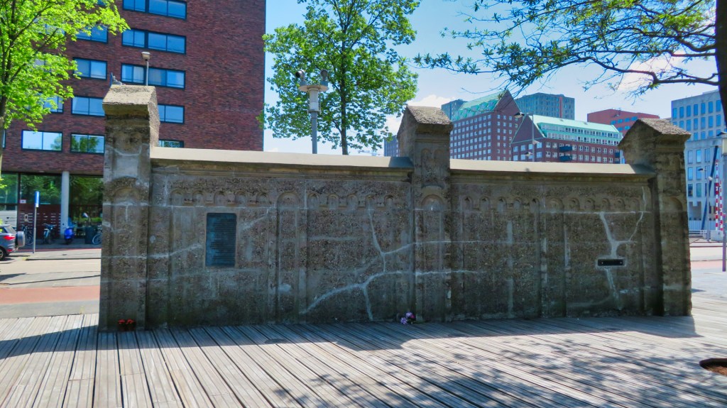 Even verderop sta ik stil bij Loods 24. Hier was vroeger een havenloods. Deze loods werd tijdens de Tweede Wereldoorlog gebruikt als verzamelpunt. Het was voor de deportatie van Joodse Rotterdammers. Tussen 1942 en 1943 werden hier bijna 7.000 mensen weggevoerd, het merendeel werd vermoord. Een gedenkmuur en het Joods Kindermonument herinneren aan deze zwarte bladzijde uit de stadsgeschiedenis van Rotterdam.
