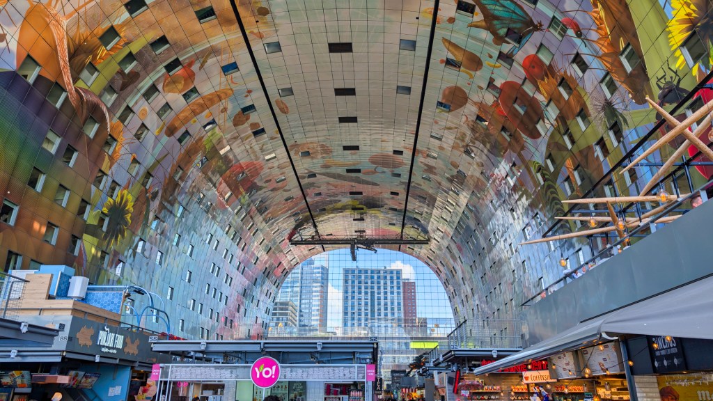 Bij een andere viskraam proef ik ook een Hollandse en een zoetere Gillardeau-oester. Daarna wandel ik de Markthal in. Aan de binnenkant van de hal hangen enorme metalen platen met het kunstwerk “Horn of Plenty”. Het is met 12.000 m² het grootste kunstwerk ter wereld. Het is zo groot als twee voetbalvelden. Je ziet er kleurrijke vruchten, vlinders en paddenstoelen, allemaal producten die je op de markt kunt kopen.