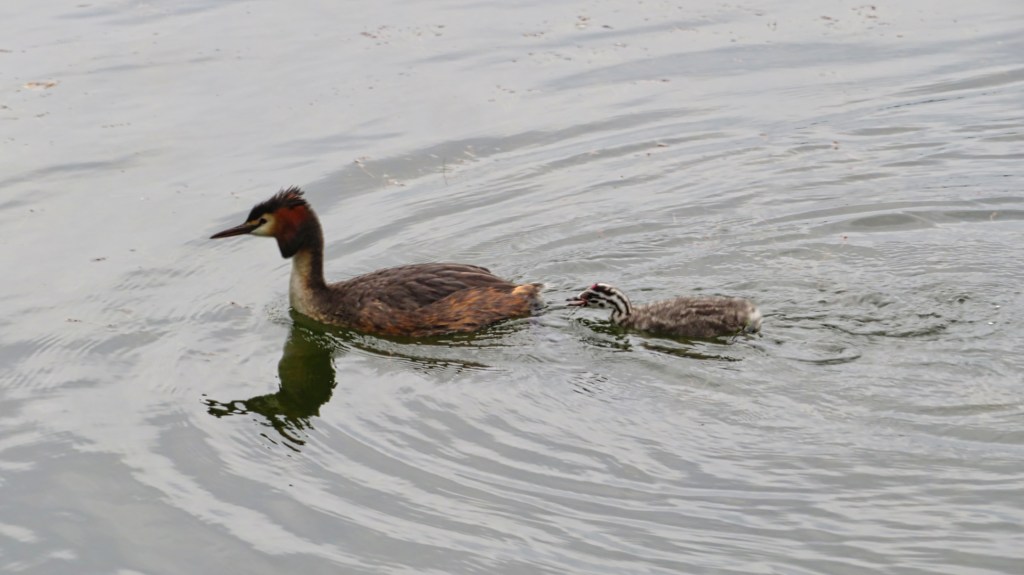 In het water zie ik twee futen met kleintjes. Het zijn kleine zwart-witte bolletjes, net mini-zebraatjes. Een meerkoet zit verscholen in het riet op haar nest.