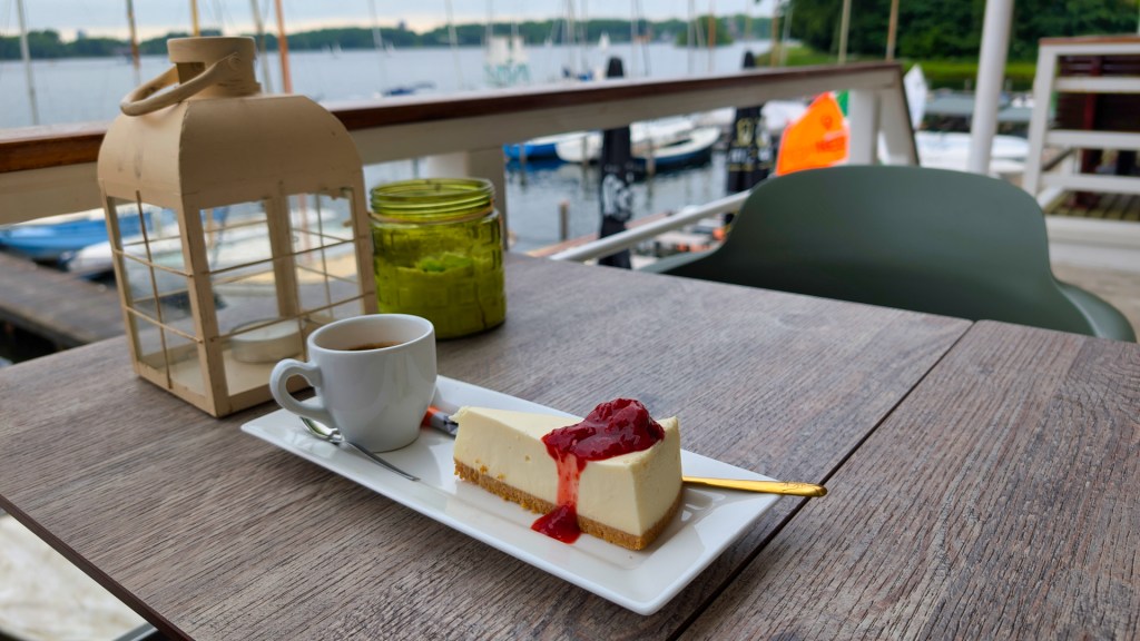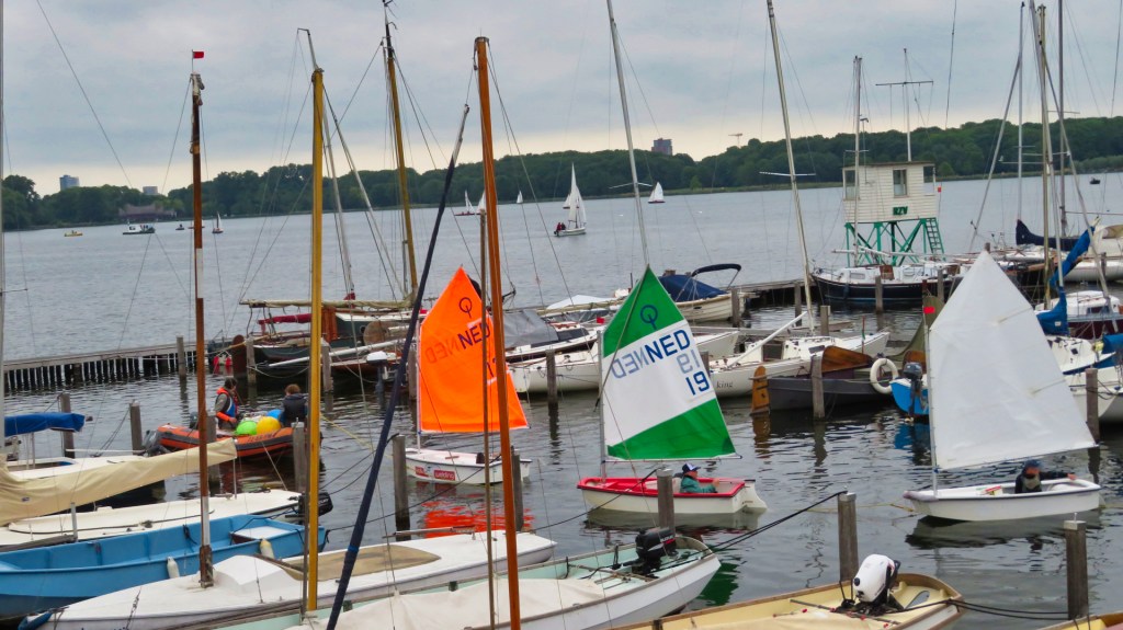 Bij de Rotterdamse Roei- en Zeilvereniging, opgericht in 1936, neem ik plaats op het terras. Ik bestel een koffie en een stuk cheesecake. Vanaf hier heb ik een mooi uitzicht op de jachthaven. Ik zie een instructeur in een roeiboot. Hij begeleidt een groepje kinderen in kleine zeilbootjes. Het ziet er koddig uit, al dat geschuifel met die kleine bootjes over het water.