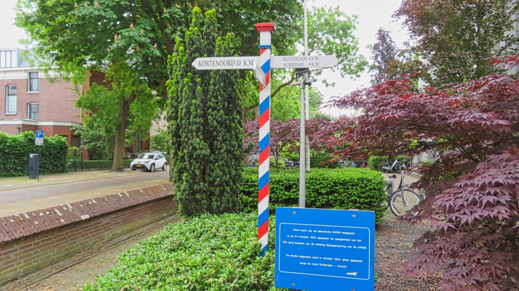 Mijn route vervolgt zich richting het oude deel van Kralingen. Ik wandel langs historische villa’s, statig en verstopt tussen grote bomen. Ik kom langs een opvallende wegwijzer: een kopie van de allereerste ANWB-wegwijzer van Nederland. Deze stond hier oorspronkelijk in 1894, toen de ANWB nog een vereniging was voor fietsers