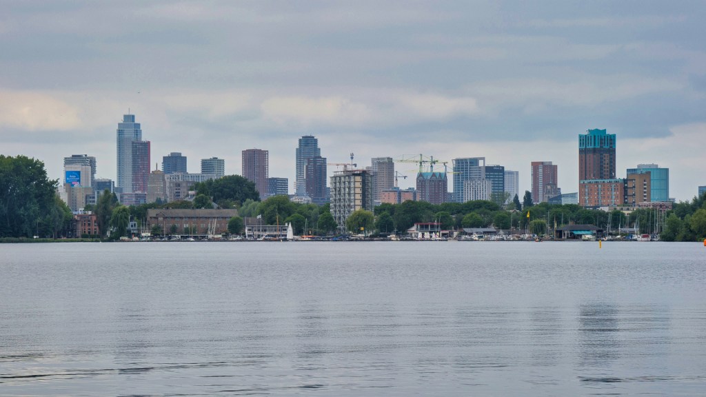Als ik weer verder wandel langs de plas, heb ik uitzicht op de skyline van Rotterdam. In de verte zie ik opnieuw de kindertjes in hun zeilbootjes. Even later passeer ik het monument van het Holland Pop Festival, dat hier in 1970 werd gehouden. Dat festival werd toen ook wel het “Europese Woodstock” genoemd.