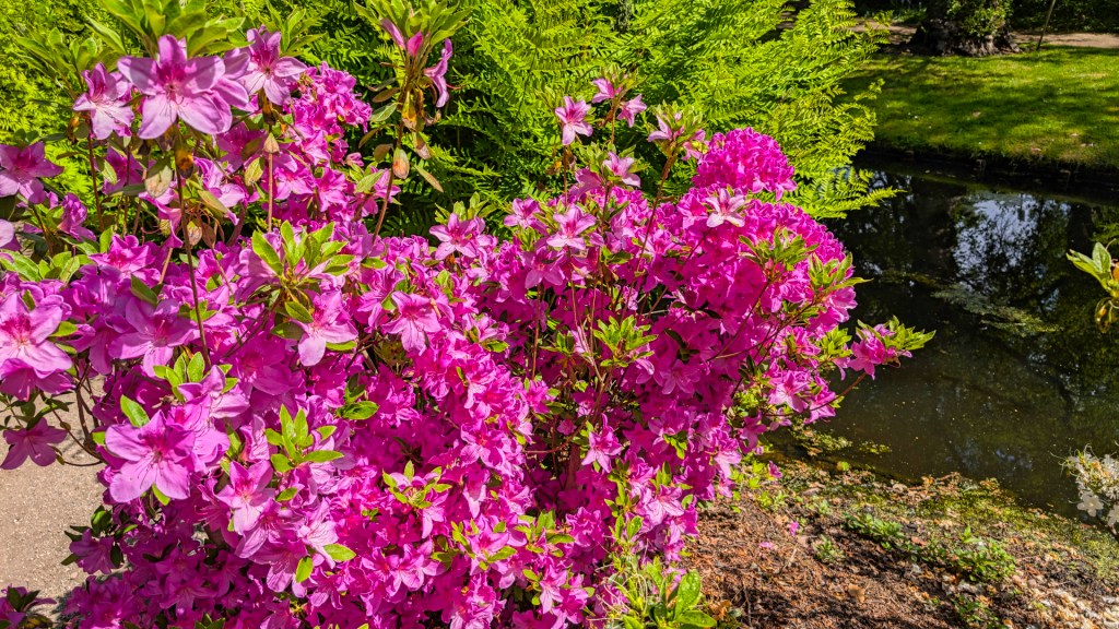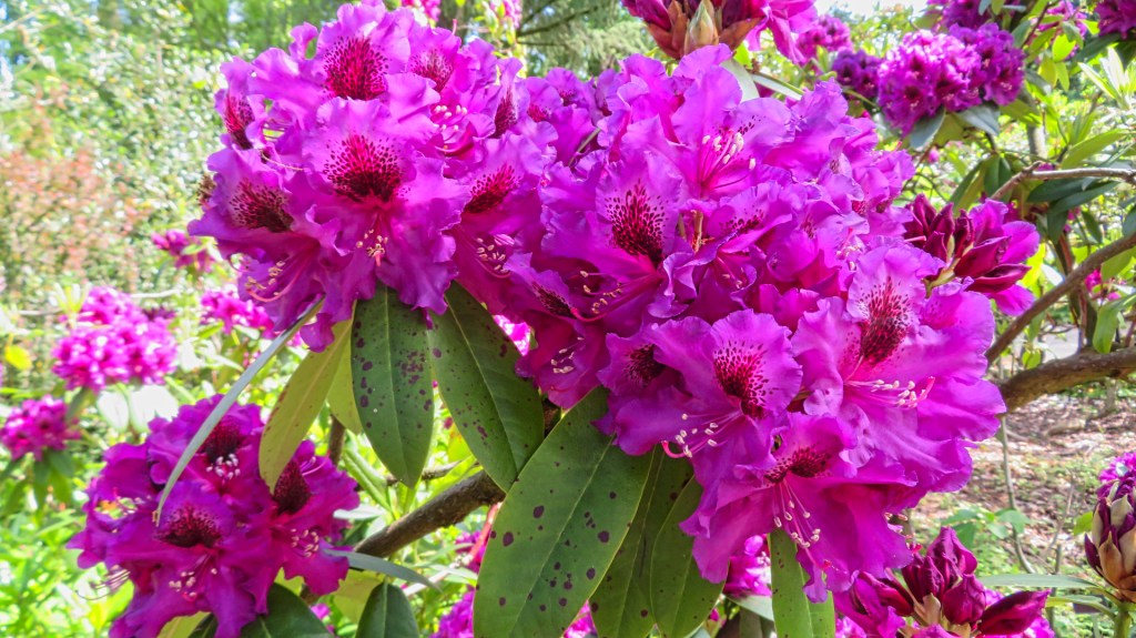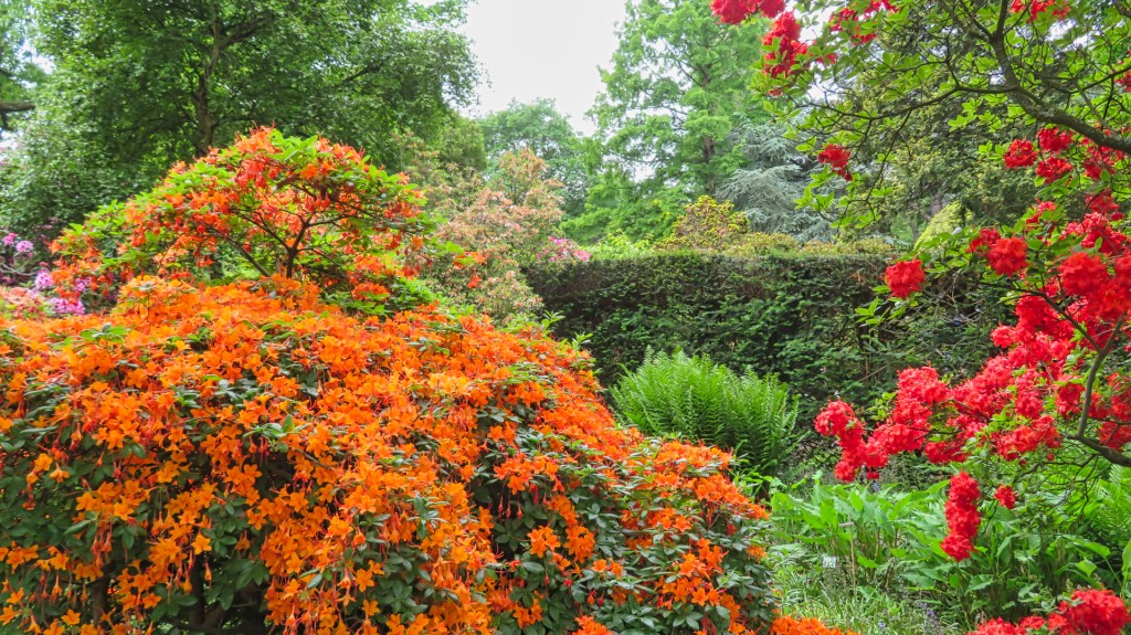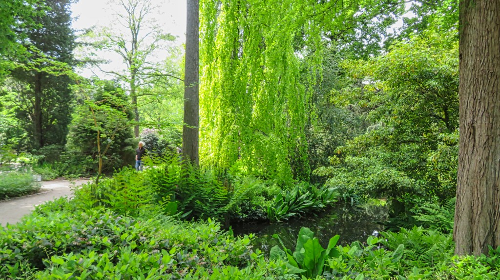Ik wandel tussen de bloeiende rododendrons in alle tinten: paars, wit, roze en rood. Verderop zie ik grote velden met hosta’s, varens, esdoorns en vetplanten. Ik volg de uitgezette route die met bordjes is aangegeven en langs alle hoogtepunten van het park leidt.