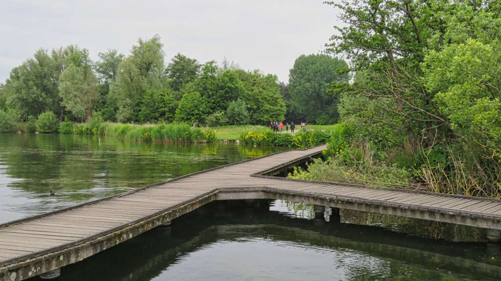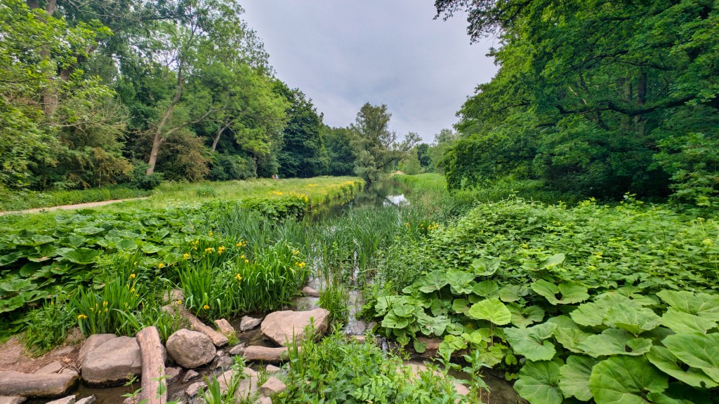 Ik wandel verder langs het strand, de kinderboerderij en door het recreatiegebied. Langs de waterkant bloeien overal felgele lisdoddes. Een winterkoninkje fluit in de bosrand. Bij een kleine waterval zie ik zelfs een ijsvogel. De helderblauwe vogel schicht over het water. Het voelt bijna onwerkelijk, zo’n stukje natuur midden in de stad. Ik wandel over een houten vlonder langs het water. Op sommige plekken is hij wat verzakt.
