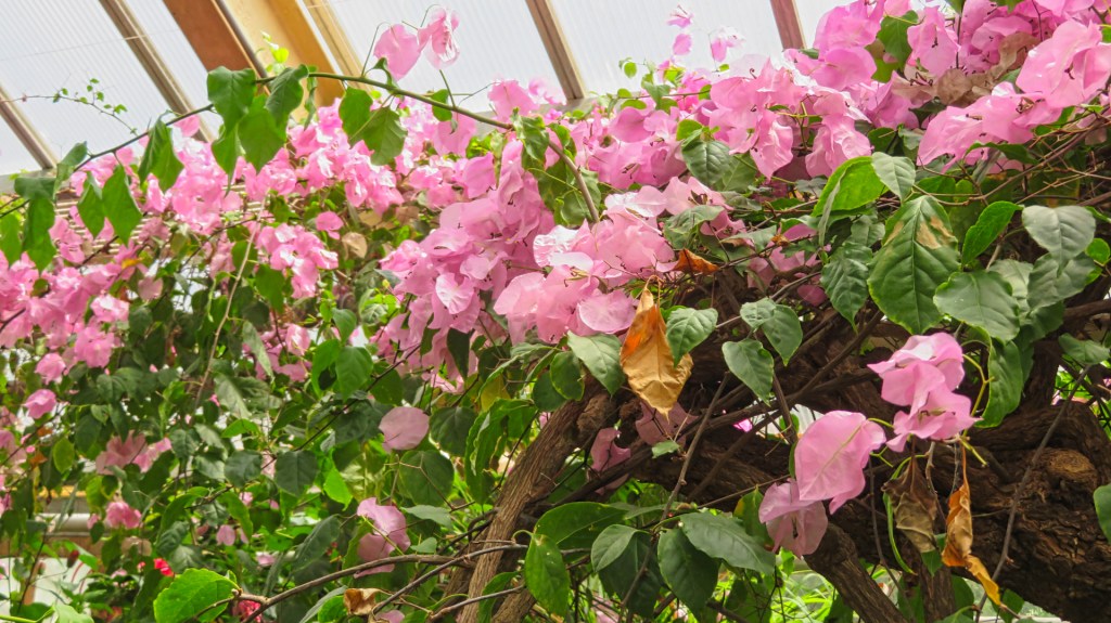 In de Victoriakas wordt het warmer. Het is de warmste plek van de tuin. Ik zie reuzenwaterlelies op het water drijven. Sommige bladeren zijn enorm. Ook zie ik prachtige waterlelies in het paars, lila en wit. Ik maak een paar foto’s van de bloemen en loop onder lichtroze bougainville door.