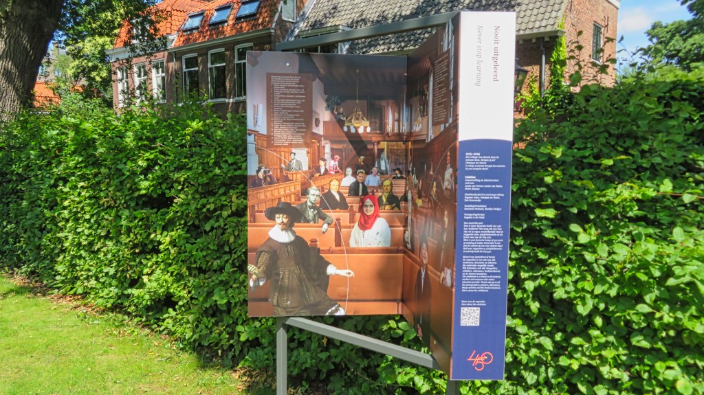 Aan de rand van de tuin kom ik bij een bijzondere buitententoonstelling: De eeuwige student. De Universiteit Leiden bestaat 450 jaar en viert dat met een overzicht van het studentenleven. Ik zie foto’s van studenten van vroeger en nu. Er zijn beelden van colleges, protesten, feestjes en studentenkamers. De foto’s hangen tussen de planten en bloemen. Dat maakt de tentoonstelling extra mooi en levendig.
