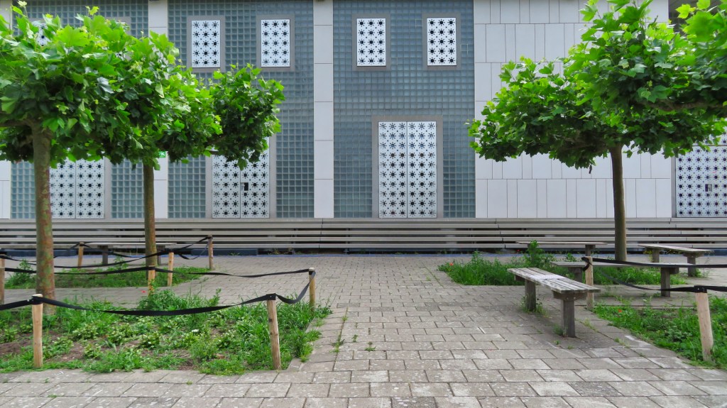 Bij het Islamitisch Centrum Imam Malik zie ik veel bijenplanten en lage bomen. Op een plein staan bankjes met speelborden waarop je kunt dammen en backgammon spelen. De speelstukken kun je ophalen bij Theehuis Noord.