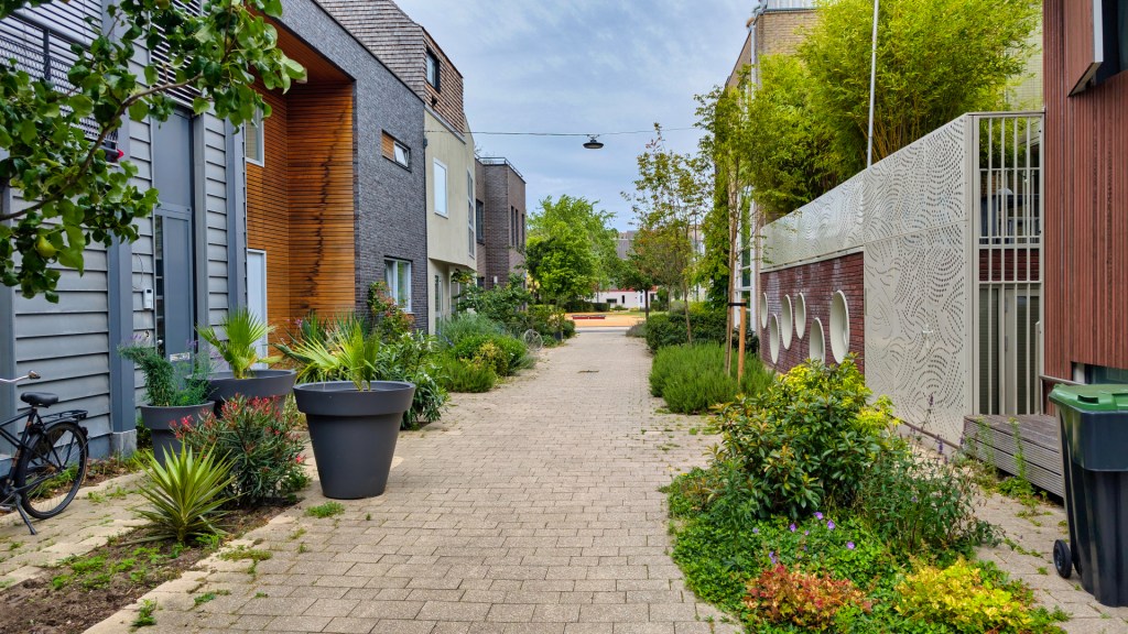 Ik verlaat het centrum en wandel door Nieuw Leyden, een moderne wijk op het terrein van het oude slachthuis. De huizen zijn ontworpen door bewoners zelf. Geen huis is hetzelfde. Ook het groen verschilt per straat. In de ene straat staan grote bloempotten. In de andere zie ik stroken met wilde bloemen.
