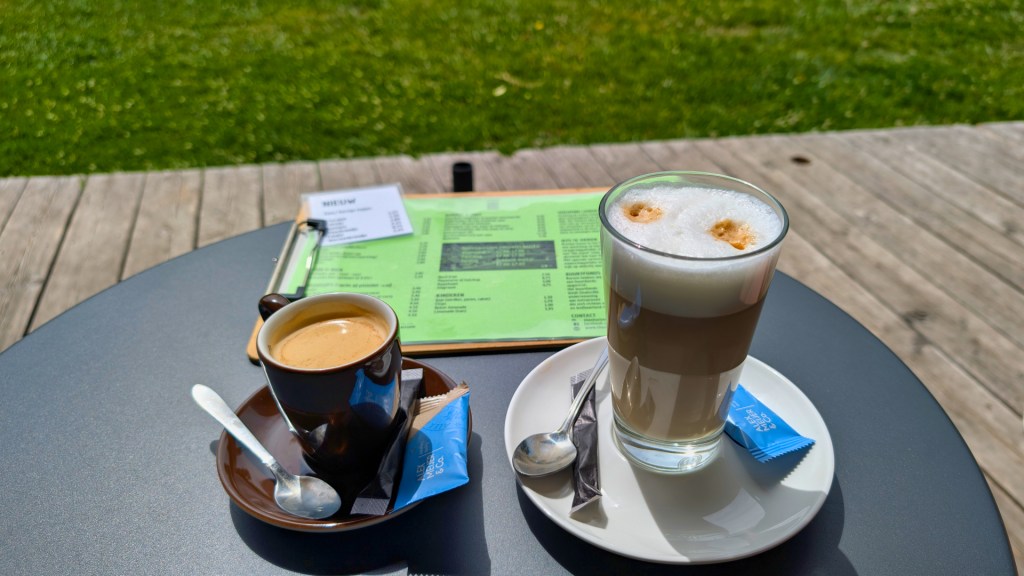 Bij het theehuis neem ik pauze. Het is open op woensdag- en zaterdagmiddag. Op zondag kun je er ontbijten. Ik bestel een broodje oma bobskroket en een latte macchiato. Een vriendelijke vrijwilliger brengt mijn bestelling naar buiten.