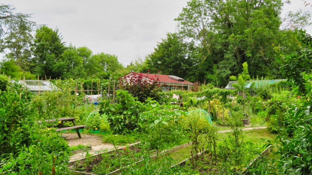 Na de lunch wandel ik verder tussen de volkstuinen. Sommige hebben een tuinhuisje met veranda, andere alleen een bankje en bloemen. In één van de tuinen zie ik opnieuw een glazen tuinhuis, net als in de tentoonstelling van Vester.