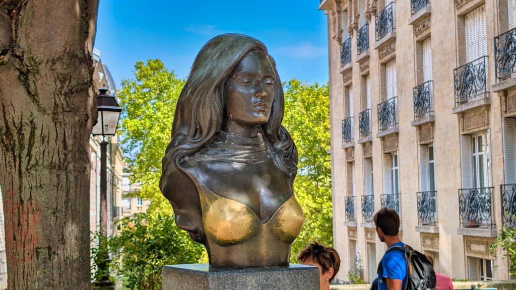 Ik steek de brug over en kom in Montmartre. Onderweg passeer ik een bakker die een TikTok-hit lijkt: jonge mensen filmen er volop. Op een plein, Place Dalida, staat een borstbeeld van zangeres Dalida, omringd door toeristen. “Het is lastig om hier een foto te maken zonder andere mensen erop,” denk ik.