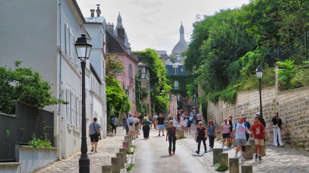Ik wandel verder door straatjes met kinderkopjes en roze huizen en langs de oude wijngaard van Montmartre.
