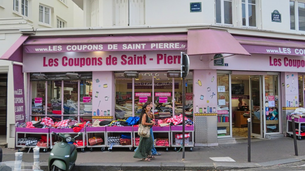 Daarna kom ik op het drukke Place du Tertre. Daar maken schilders en tekenaars karikaturen en portretten. De terrassen zijn kleurrijk aangekleed. Ik doe geen poging om de Sacré-Cœur van binnen te bezichtigen omdat de rij te lang is. Ik daal af via smalle trappen aan de zijkant. Ik kom aan bij Place Saint-Pierre. Het is een waar paradijs voor stoffenliefhebbers. De winkels, zoals Dreyfus Déballage du Marché Saint-Pierre en Tissus Reine, hebben etalages vol kleurrijke stoffen, knopen en ritsen.